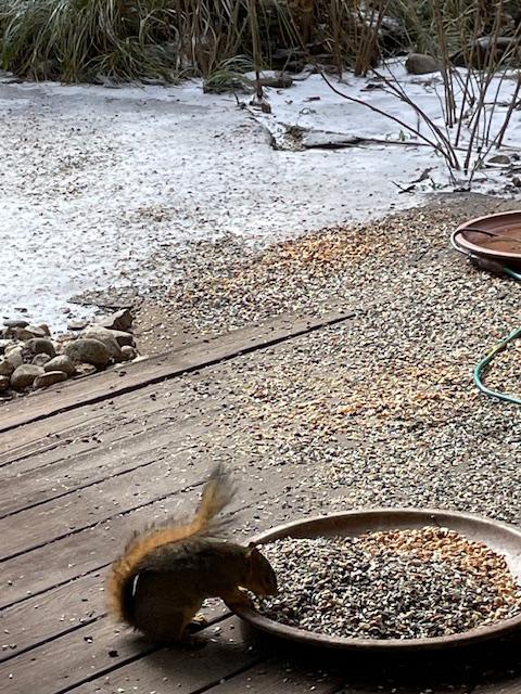 Squirrel eating seed in feed bowl with snow in the background