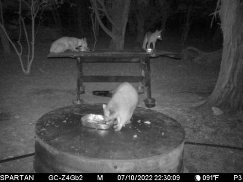 Bobcat, Fox and Raccoon at their feeding bowls of Chicken at the feeding tables