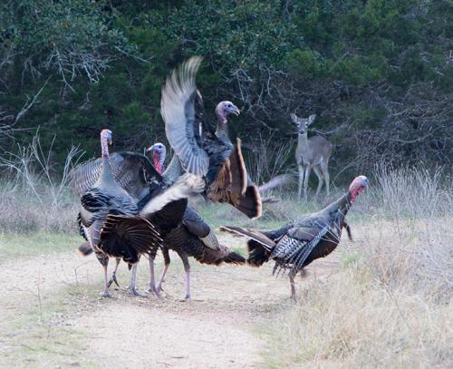 A group of Tom Turkeys fighting while Doe Deer watches in the background.
