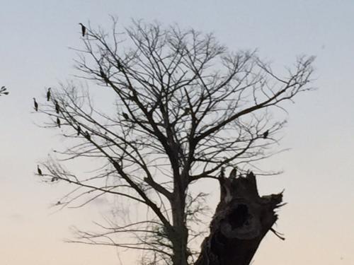 A group of Turkeys roosting in Bald Cypress tree at dusk