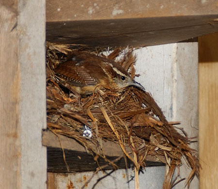 Carolina Wren nesting in barn. (see baby fledges in next photo)