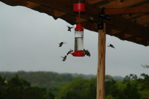 Hummingbirds swarm and share a feeder at dusk