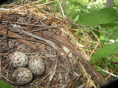 Cardinal nest with three eggs, nest is made of twigs and Ashe Juniper bark