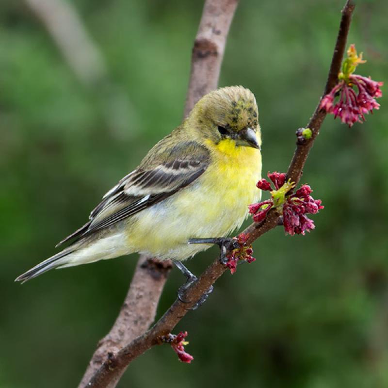 Juvenile male Goldfinch in winter plumage, perched on a Mexican Buckeye tree.