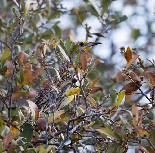 Western Meadowlark seen on the ground in tall grasses, then flew into an Oak Tree.