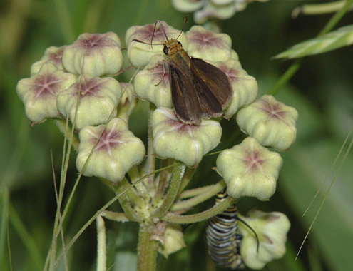 Dun Skipper on Antelope Horn and a Monarch caterpillar in lower right corner