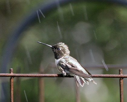 juvenile Black-chinned Hummingbird bathing in sprinkler spray