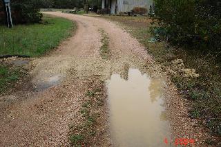 A dirt berm across the road diverts rain water off of the road and into the woods. This berm needs more dirt on the right side so that water does not puddle on the road but runs off to the left instead. A one inch rain allowed us to survey our efforts.