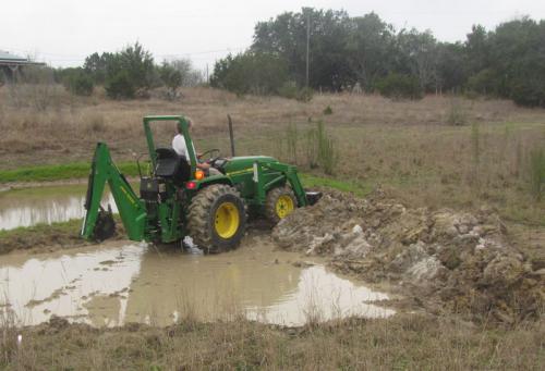 Caretaker adjusts dirt dam to relieve water collection on pond near the Hay Barn (seen in the upper left corner)