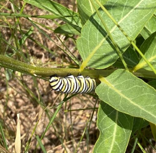 Monarch Butterfly caterpillar feeding on Antelope Horn flower