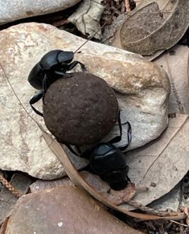 Male and female cooperate to push and pull dung ball to bury in the ground and lay eggs