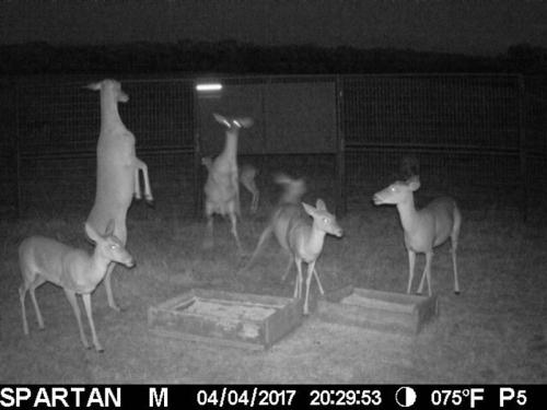 Deer inside the live feral hog trap caught on remote camera. The remote trigger system is the best to avoid trapping other animals besides the feral hogs.