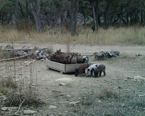Group of young feral hogs at the feeding area in a box of milo for the deer hunters.