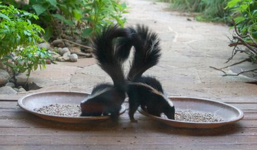 Two young Striped Skunks eating seeds