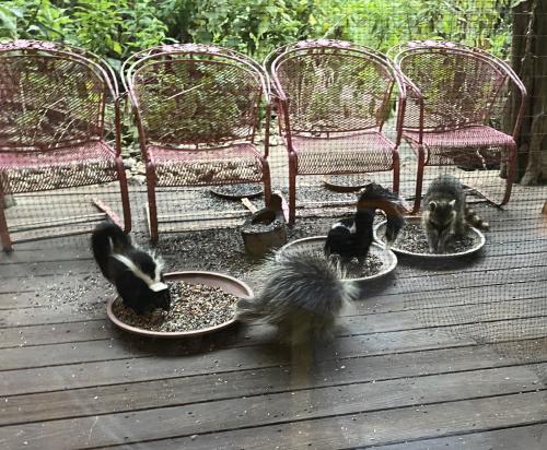 Striped Skunks, Raccoons and Pocupine all sharing seed bowls on porch