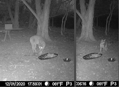 Bobcat at Gray Fox feeding area, by comparison, the Gray Fox at same feeding bowl on alert