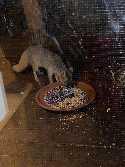 Even though caretakers are feeding chicken to the Foxes, they also eat grapes and seeds put out for birds and Raccoons.