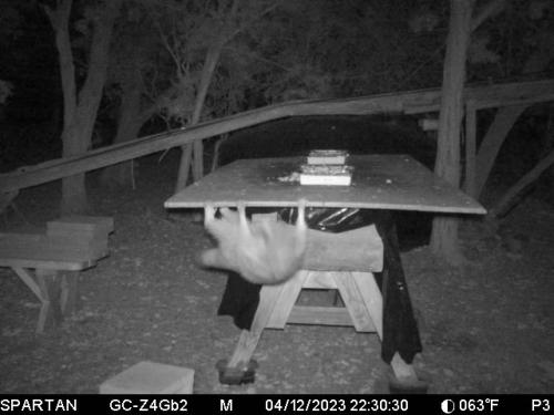 Raccoon trying to get onto fox feeding table with chicken and grapes