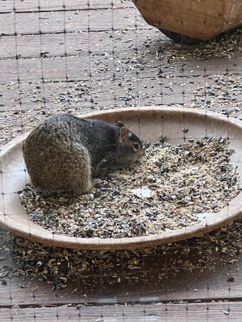 Rock Squirrel has lost its tail, but seesm to be geting along fine in the seed bowl.