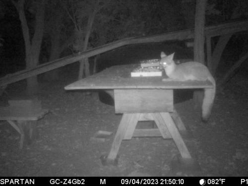 Fox resting on feeding table
