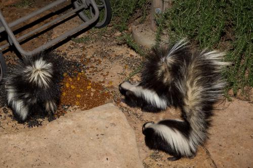Skunks at feeding area eating dogfood