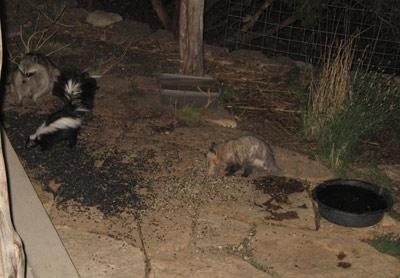 Raccoon, Skunk and Possum sharing dogfood and Black oil sunflower seeds at feeding area