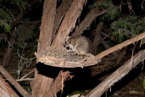 Baby Raccoon eating Sunflower seeds in the birdseed tree stand