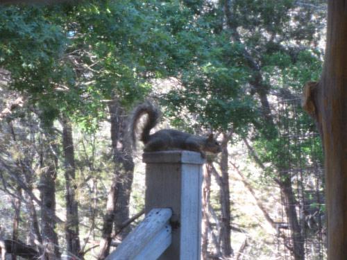 Squirrel resting on top of stairwell banister