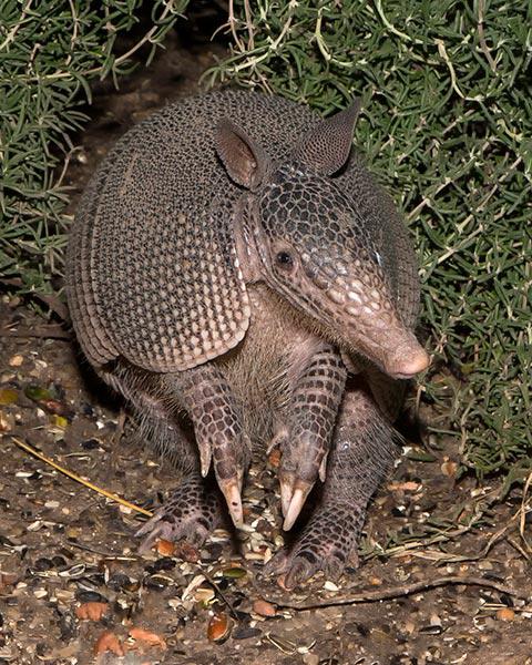 Armadillo cleaning up bird seed that had fallen from the feeders.