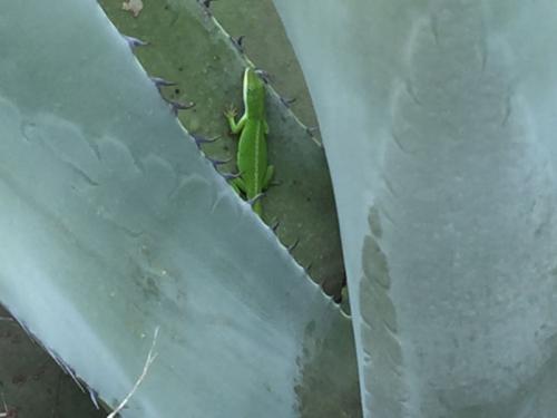 Anole Lizard is safe among the spiked leaves of the Century Agave cactus.