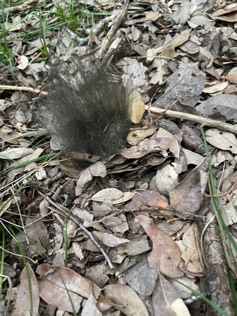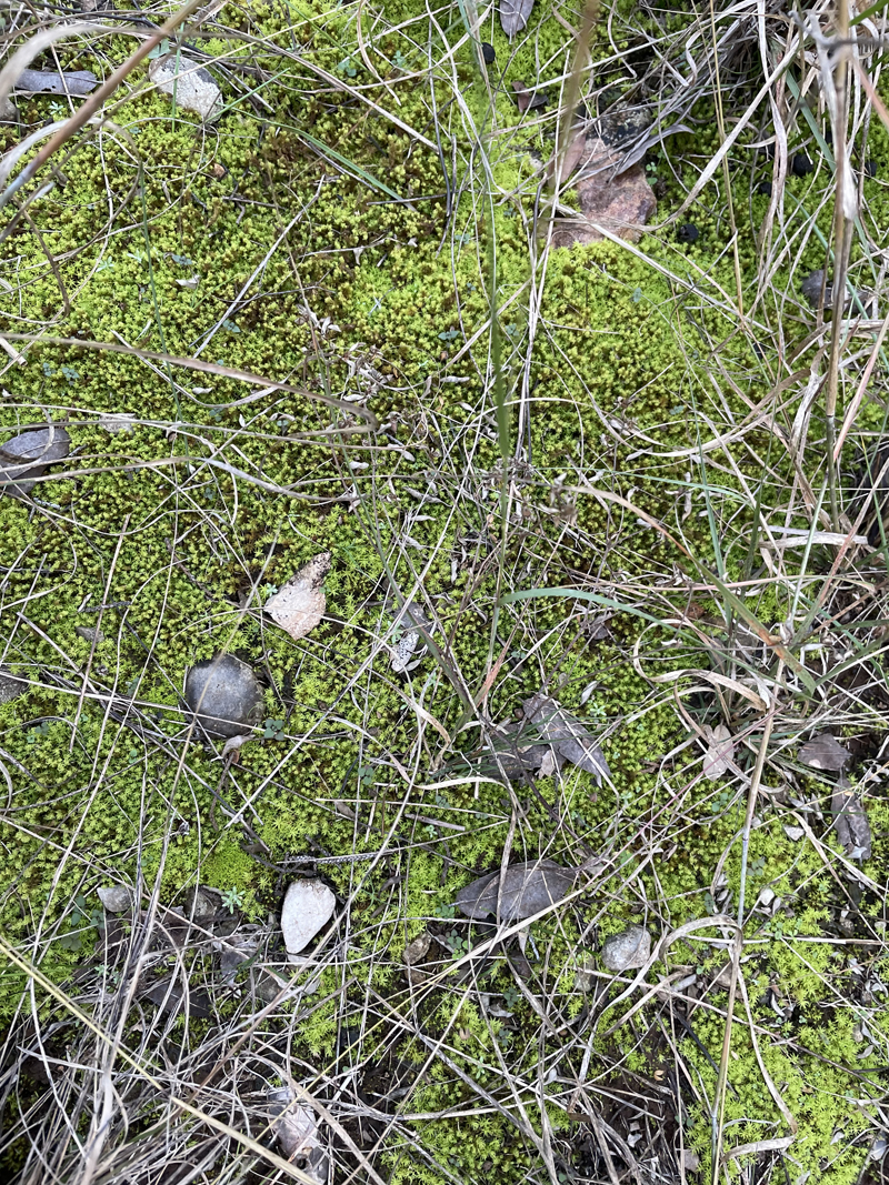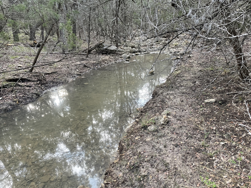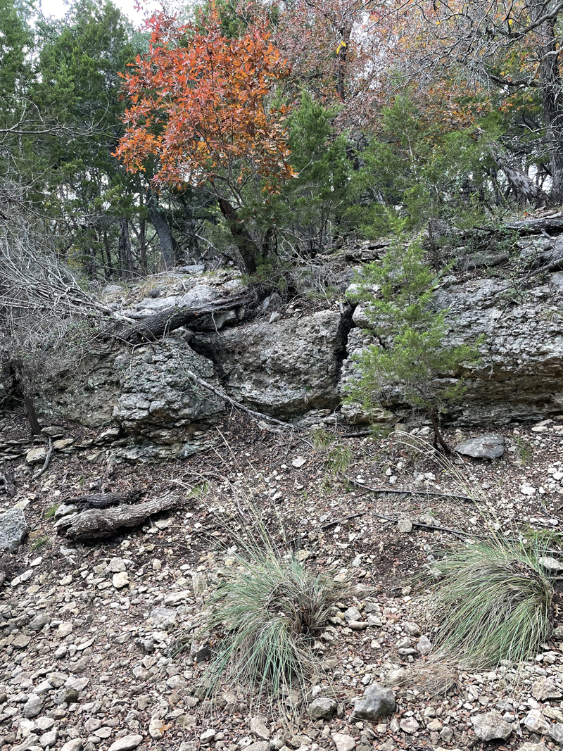 A scene of a rock wall along the edge of the Draw. A Red Oak is growing out of bare rock and Muhly grasses in the foreground
