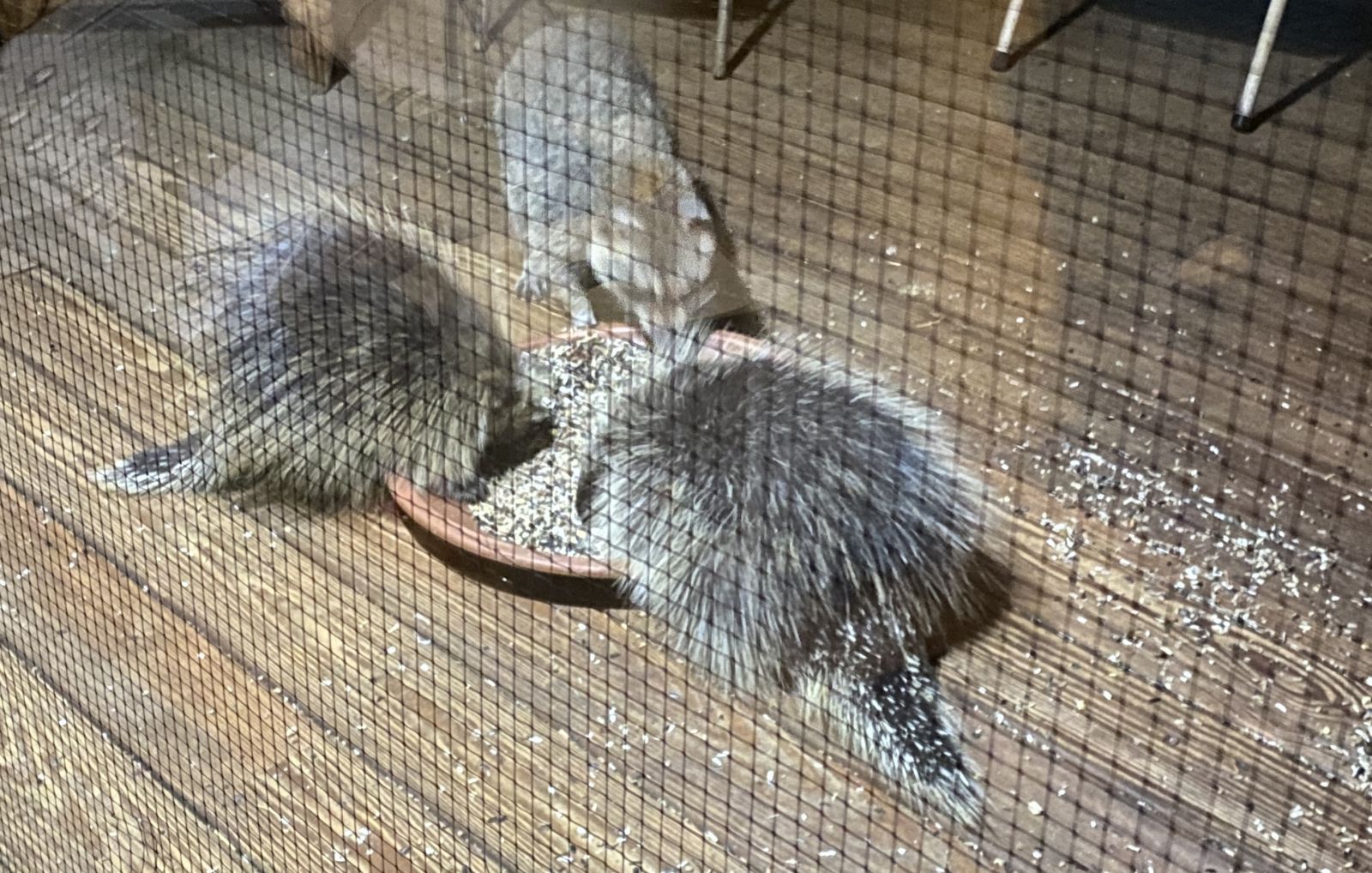 Caretakers established a new feeding area for Racoons near the bluff edge to the river. A large cage is erected over a place with bare exposed rock, to scatter dry dog food and bird seed. This was done to prevent the Racoons from gathering too closely together on the porch. The cage was later expanded to a taller height to prevent deer from jumping inside.