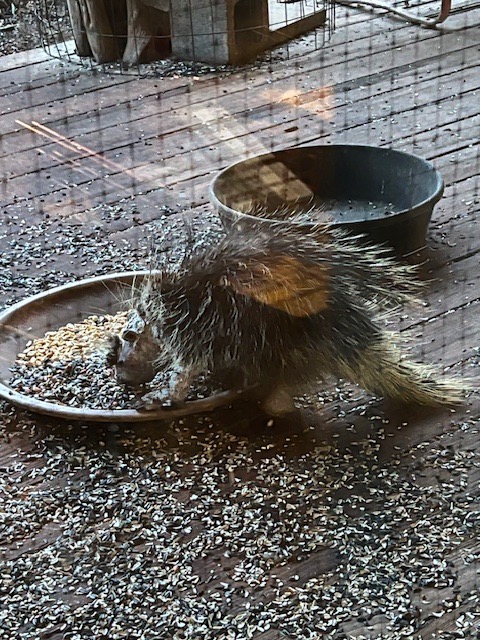 Porcupine with signs of disease and obviously not well. Caretakers later learned that it is a skin disease related to ringworm fungus. This strain of skin fungal disease (ringworm) affects porcupines more than other small mammals.