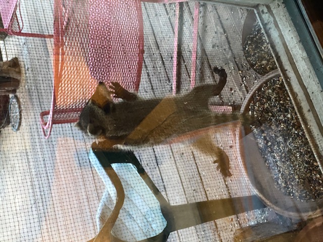 Young Raccoon climbing the window screen near the seed bowls