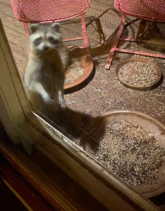 Raccoon looks in the window from the feeding seed bowls on the porch