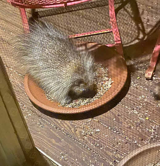 Porcupine eating out of seed bowls on porch.