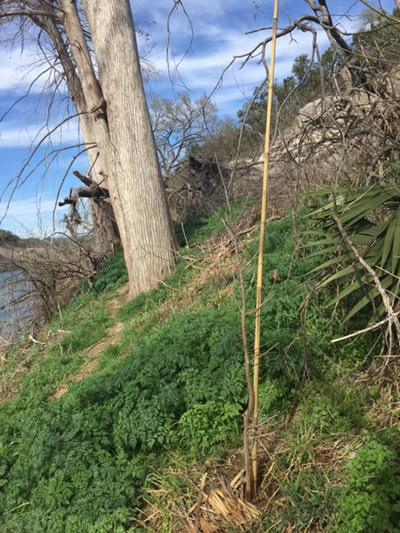 A newly planted 6 foot tall Bald Cypress tree, supported with a bamboo stake. The Saw Palmetto in the middle right of the photo is a clue for a wet place to plant a tree. It has since been caged to avoid deer browse.
