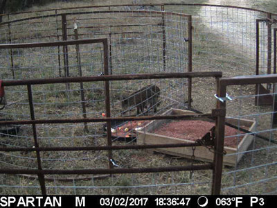 A borrowed small feral hog used as bait to catch the last lone feral hog that could not trigger the trip wire due to its small size. This animal is inside a cage within the trap.
