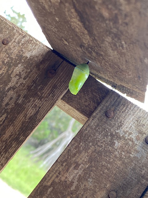 Successsful Monarch Butterfly Chrysalis using the old crate that caretakers provided in the Anetlope Horn field on April 25.