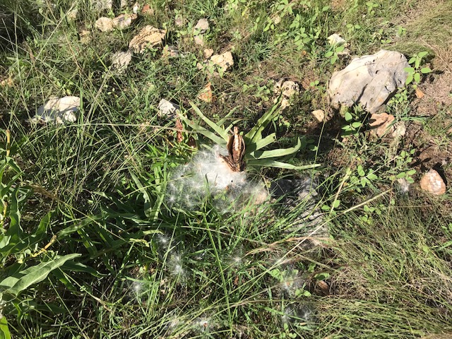 Antelope Horn going to seed, the feathery seeds float in the wind. This plant is in the milkweed family and is a host plant for Monarch Butterflies. The female lays eggs on the plant, the caterpillars feed on the leaves and flowers, then pupate into a chrysalis, before emerging as an adult Monarch Butterfly.