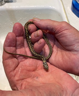Caretakers found small snake in basement, rescued it and set it free in house pond.