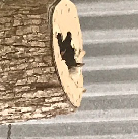 One of four Wrens fledging from the nest. Caretakers made a nest box out of a piece of holllow Oak branch, and stapled a crude 'door' on the end. It is hung with a hook attached to the underside of the porch roof. All four fledges left the nest the same day and around the same time.