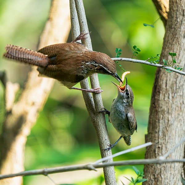 Newly fledged baby Wren being fed live meal worm by its mother.