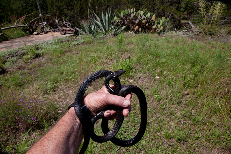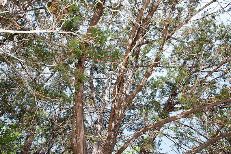 Caretakers note: The Central Texas Whip Snake was released and quickly slid to the top of this Ashe Juniper tree. The red underside of its belly is visible as a thin horizontal line in the upper center of the photo.