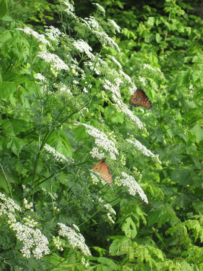 Queen Butterflies (Danaus gilippus) on Queen Anne's Lace Flower (Daucus carota) at lush river bottom land