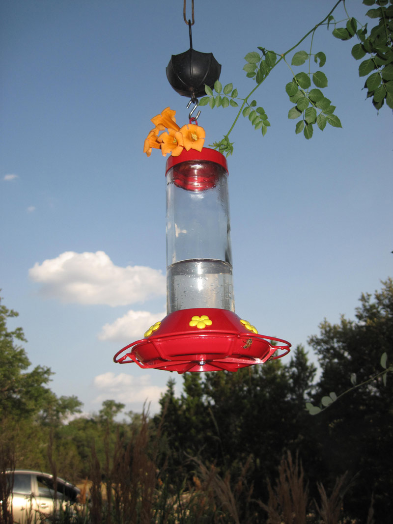 Hummingbird feeder with Creeper Vine flower, the black cup at the top is filled with water as an ant guard.