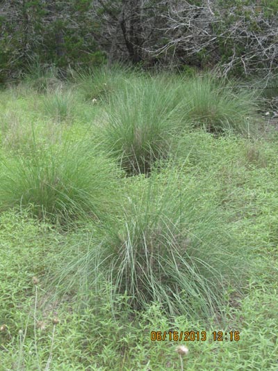 Lindheimer Muhly (Muhlenbergia lindheimeri) also called Big Muhly near the headwaters of the draw on the upland outcrop. Its root syetm is good for soil stabilization. This species is endemic to the Edwards Plateau.