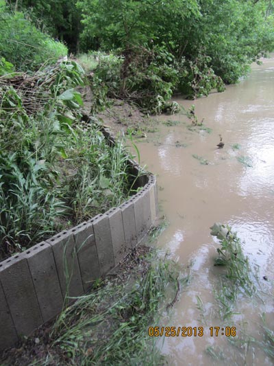 River flooded the walking trail and the new wall bank, uphill of the trail, worked well to hold the slope in place.