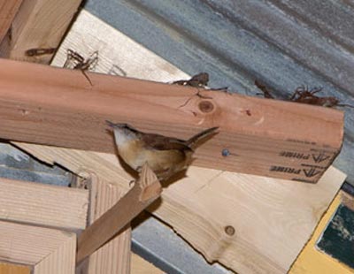 Female Carolina Wren inspecting the contruction site for a nesting place. Caretakers closed all access windows to discourage her from nesting in a place that is insecure for them.